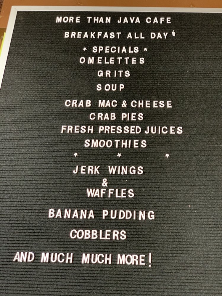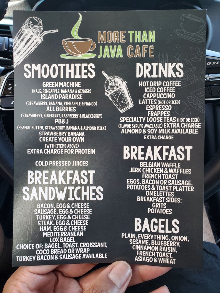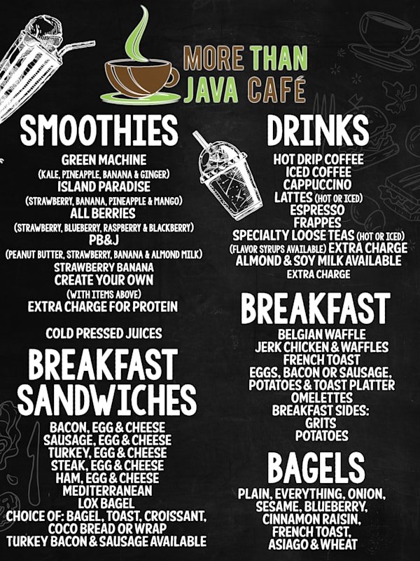 More Than Java Café offers a variety of delicious breakfast and brunch options in a welcoming and inclusive environment. Their menu features a selection of mouth-watering breakfast sandwiches, including classics like Bacon and Egg Sandwich and innovative choices like Mediterranean Sandwich. For those looking for heartier options, the breakfast entrees like Jerk Chicken & French Toast and Veggie Omelette Platter are sure to satisfy. Don't forget to add some tasty sides like Grits or Vegan Sausage Patties to complete your meal. With options for vegan and meat lovers alike, More Than Java Café is a must-visit spot for a fulfilling and enjoyable breakfast or brunch experience. The wide range of amenities like outdoor seating, free Wi-Fi, and gender-neutral restrooms make it a comfortable and convenient choice for patrons of all backgrounds. My experience at More Than Java Café left me impressed with the flavorful dishes and welcoming atmosphere, making it a standout destination for breakfast and brunch enthusiasts.